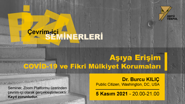"Aşıya Erişim – COVİD-19 ve Fikri Mülkiyet Korumaları" başlıklı seminer, Public Citizen (Washington, DC, USA)'den Dr. Burcu Kılıç tarafından sunulacaktır.