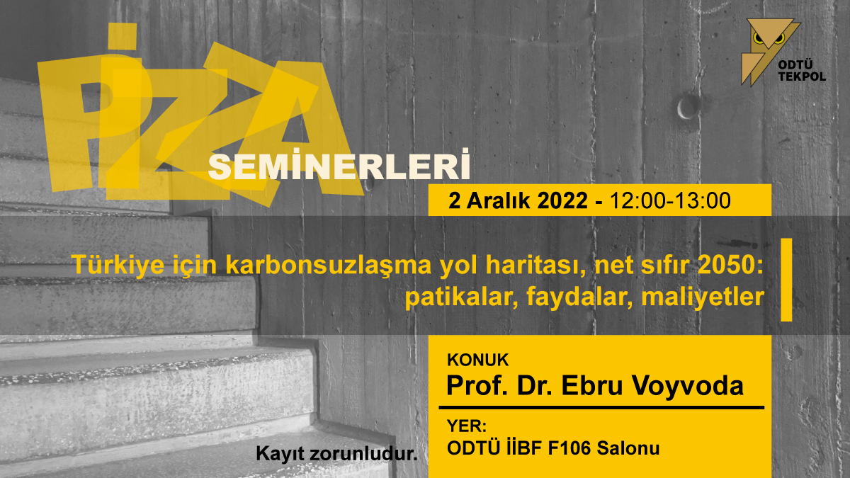 'Türkiye için karbonsuzlaşma yol haritası, net sıfır 2050: patikalar, faydalar, maliyetler' başlıklı seminer ODTÜ İktisat bölümü öğretim üyesi Prof. Ebru Voyvoda tarafından sunulacaktır.